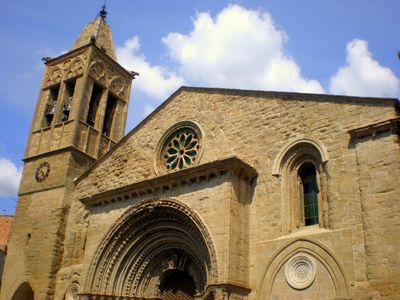 Die Kirche verfügt über drei Schiffe mit Tonnengewölben, eine dreifache halbrunde Apsis und einen gotischen Glockenturm aus dem 14. Jahrhundert.