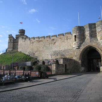 Lincoln Castle ist eine Burg auf einem Hügel in Lincolnshire mit zwei künstlichen Hügeln, Steinmauern und Türmen innerhalb einer befestigten Anlage. Die Festung umgibt ein viktorianisches Gefängnis und andere mittelalterliche Strukturen, die Besucher erkunden können.