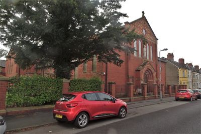 Das Kirchengebäude zeigt klassische Ziegelarchitektur mit markanten Fenstern und einem Mittelturm, der sich von der Skyline Cardiffs abhebt.