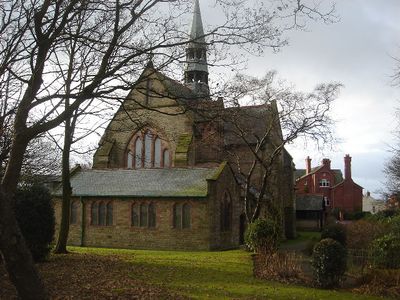 Das Steingebäude weist einen kreuzförmigen Grundriss mit einem achteckigen Dachreiter, Querschiffen und roten Sandsteinverzierungen aus Runcorn auf.