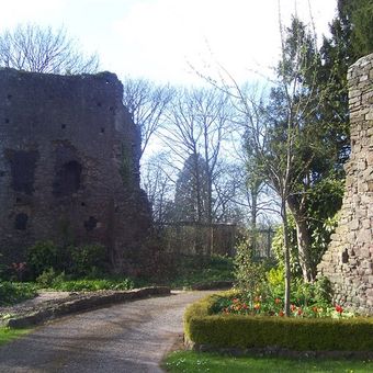 Tiverton Castle ist eine Steinburg an den Ufern des Flusses Exe mit erhaltenen Mauern, einzelnen Gebäuden und mehreren Türmen. Die Anlage ermöglicht einen Blick auf die Befestigungsstruktur, die sich über das Gelände erstreckt.