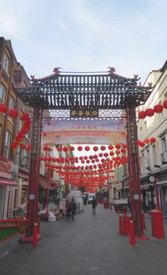 Rote Laternen, chinesische Schilder und traditionelle Dekorationen kennzeichnen diese Straße als Zentrum der chinesischen Gemeinschaft Londons.