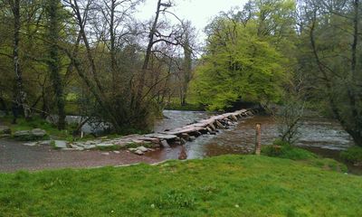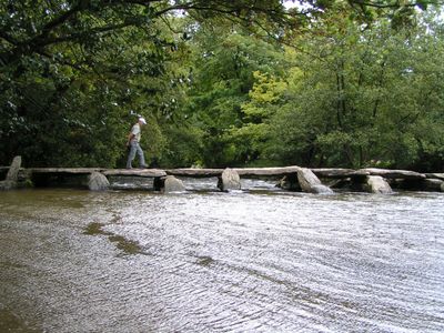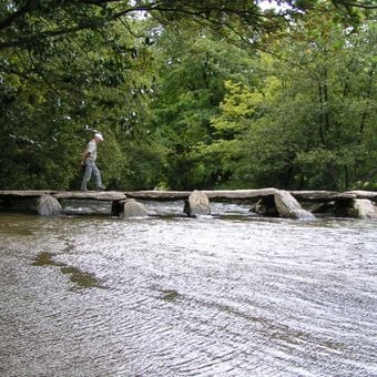 Tarr Steps ist eine Steinbrücke aus Granit in Withypool and Hawkridge bei Dulverton, England, die sich über den Fluss Barle erstreckt. Die Brücke besteht aus 17 großen flachen Steinplatten, die Ende an Ende auf Steinpfosten im Wasser ruhen und etwa 55 Meter lang sind.