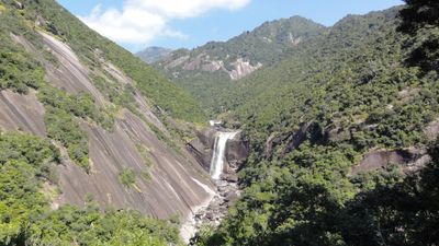 Der Senpiro-Wasserfall stürzt eine massive Granitwand hinab und bildet einen 60 Meter hohen vertikalen Fall in einem V-förmigen Tal auf der Insel Yakushima.