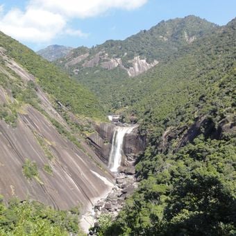 Der Wasserfall fließt über eine Granitformation von 250 mal 300 Metern und erzeugt bei unterschiedlichen Regenintensitäten verschiedene Muster.