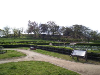 Der Tsudo-Shiroyama Kofun misst 210 Meter in der Länge und weist eine Schlüssellochform mit doppelten Wassergräben um den Grabhügel auf.