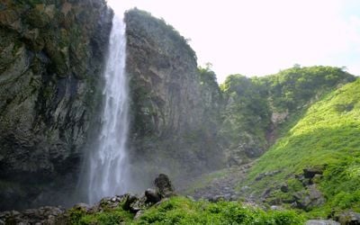 Der Hyakuyojō-Wasserfall präsentiert einen vertikalen Wasserfall von 90 Metern Höhe und 10 Metern Breite über der Seijogahara-Ebene.