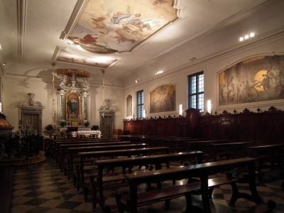Die Decke zeigt ein Fresko der Mariä Himmelfahrt und eine Engelsglorie, während die Wände acht biblische Szenen enthalten.