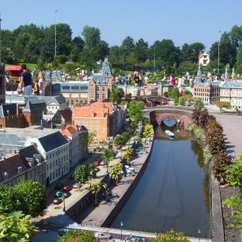 Madurodam ist ein Park in Den Haag, der die Niederlande in verkleinertem Maßstab zeigt und über hundert Nachbildungen von Gebäuden, Brücken, Häfen und Infrastrukturen umfasst. Die Modelle stehen entlang gepflegter Wege, zwischen gepflanzten Bäumen und nachgebildeten Wasserläufen, die den Eindruck echter niederländischer Landschaft vermitteln.