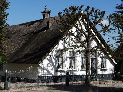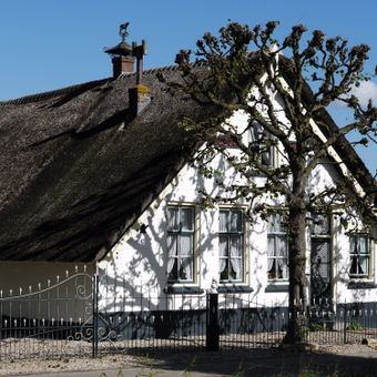Boerderij, dwarshuis, gepleisterd, topgevels, dak rietgedekt