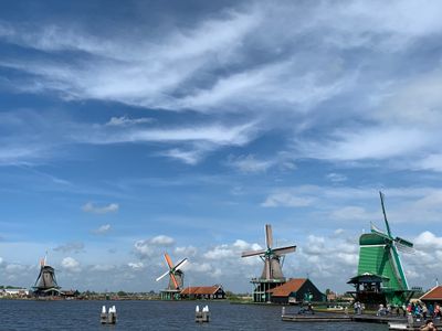 Zwei Windmühlen in Zaanse Schans stehen noch an ihren ursprünglichen Standorten, während andere aus verschiedenen Regionen hierher gebracht wurden.