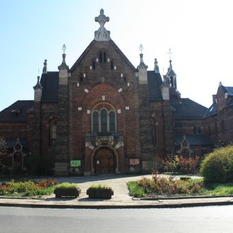 Die Sankt-Josef-Schutzkirche verfügt über einen 80 Meter hohen Uhrenturm und detaillierte Mauerarbeiten mit Heiligenskulpturen an der Außenfassade.