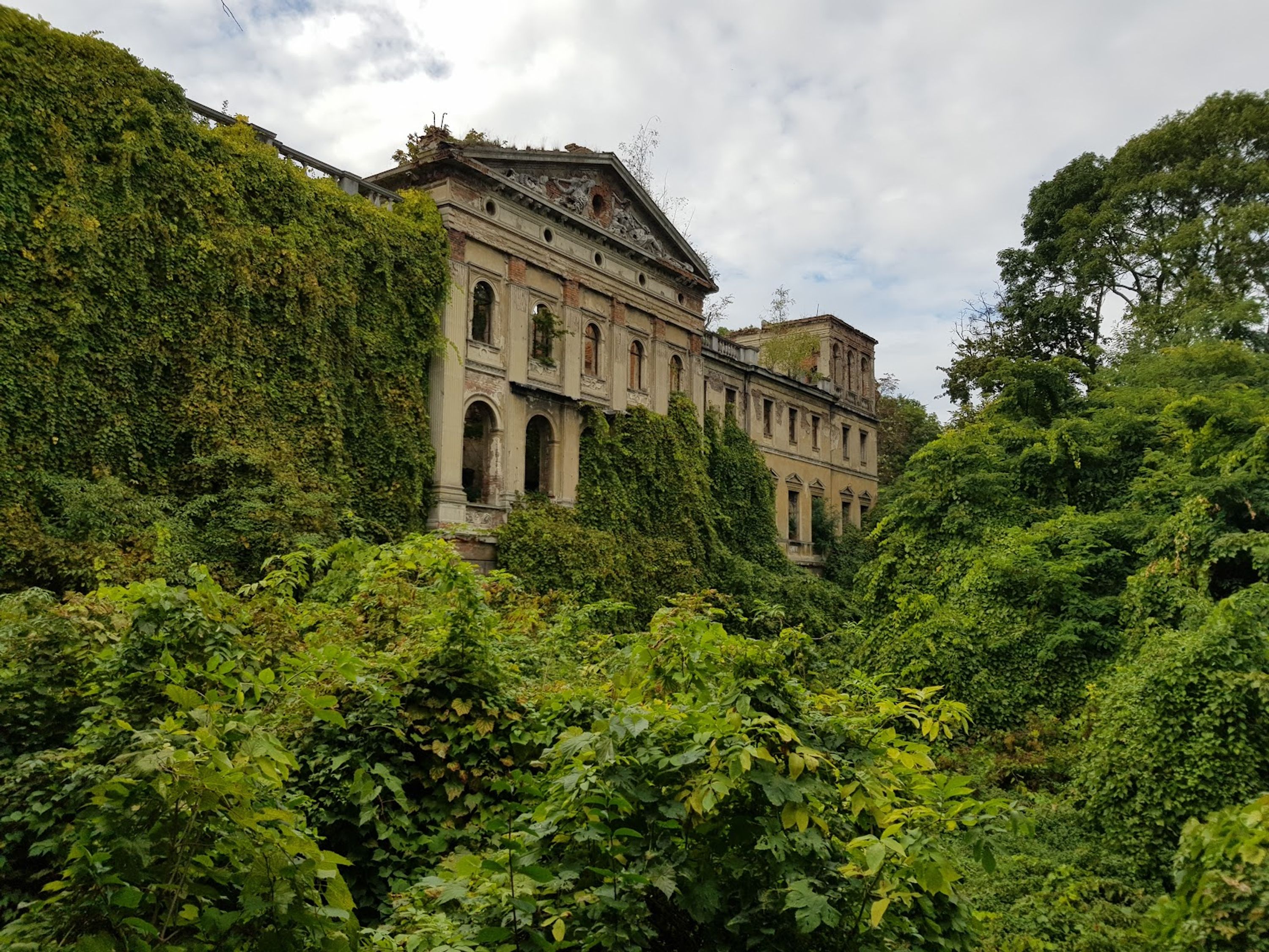 Der Palastkomplex von Sławików zeigt die Ruinen einer aristokratischen Residenz aus dem 19. Jahrhundert, umgeben von Landschaftsgärten mit überwachsenen Wegen und ornamentalen Überresten.