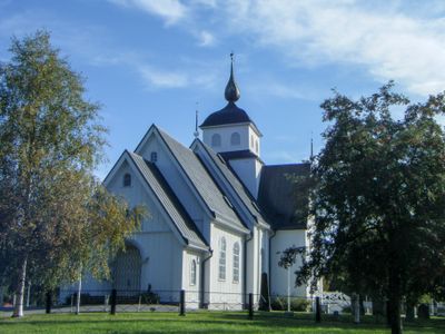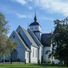 Das Kirchengebäude zeigt traditionelle skandinavische Architektur mit weißen Außenwänden und einem hohen Mittelturm.