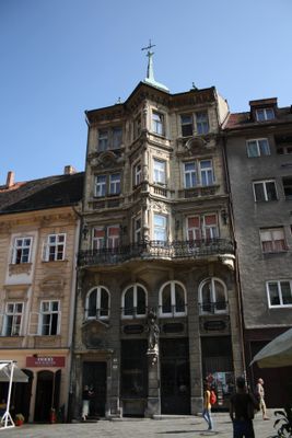 Das fünfstöckige Renaissance-Gebäude zeigt eine Fassade mit einer Christusstatue, die vom Bildhauer Alojz Rigele geschaffen wurde.