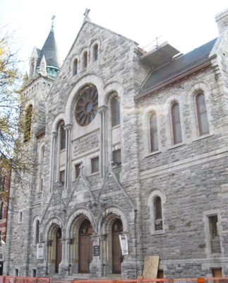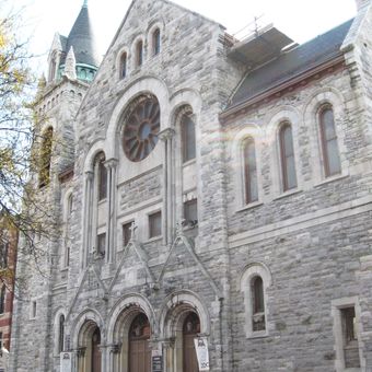 Die Heilige Rosenkranz Kirche steht mit ihrer traditionellen Steinfassade und detaillierten architektonischen Elementen an der Kreuzung der East 119th Street.