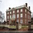 Das John Brown Haus zeigt eine dreistöckige Ziegelstruktur mit Walmdach, vier Schornsteinen und einem Eingang mit dorischen Säulen.