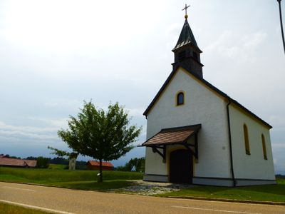Baudenkmal D-3-75-210-41 in Wörth an der Donau im Ortsteil Weihern, Kath. Nebenkirche Mariä Namen, giebelständiger Saalbau mit abgewalmtem Satteldach und verschindeltem Dachreiter, 1933.