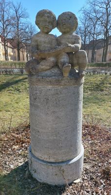 Zwei Mädchen mit Liederbuch und Katze, Skulptur im Berliner Ortsteil Buch