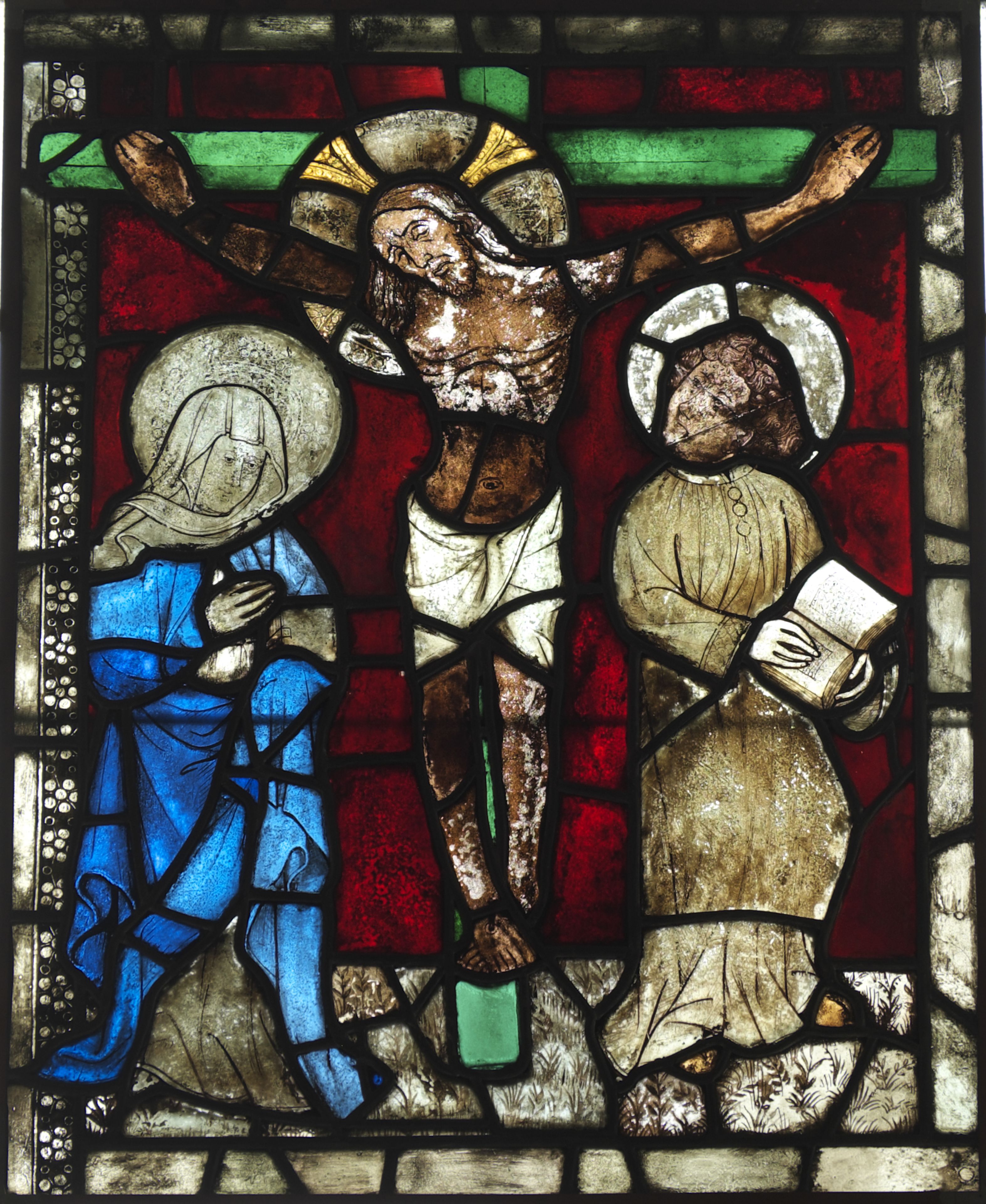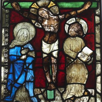 Christus am Kreuz, Glasgemälde im Dom zu Verden in Verden, einer Stadt im Landkreis Verden in Niedersachsen