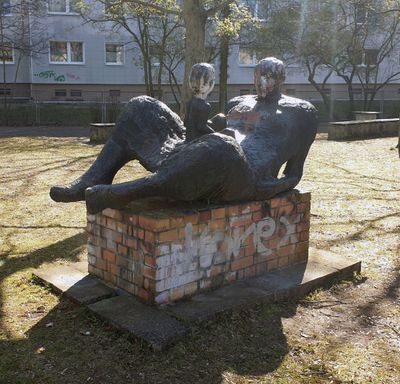 Liegende Frau mit Kind, Skulptur von Emerita Pansowová im Berliner Ortsteil Johannisthal
