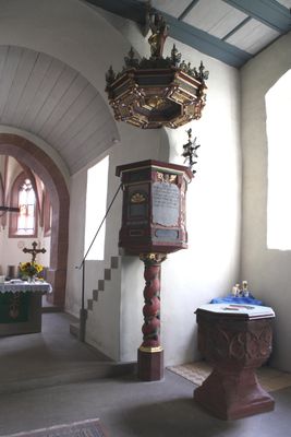Kanzel, Kanzel in der evangelisch-lutherischen Kirche St. Oswald in Großwalbur, einem Gemeindeteil der oberfränkischen Gemeinde Meeder im Landkreis Coburg
