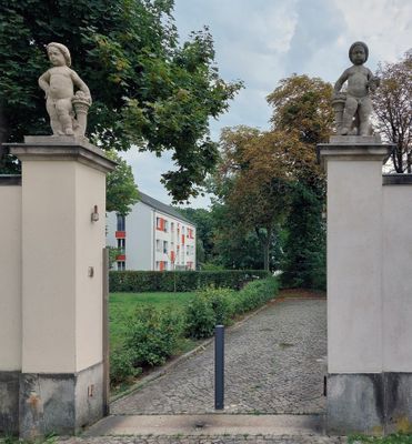 Stehende Knaben mit Füllhörnern, zwei Skulpturen auf Torpfeilern von Ignatius Taschner in Berlin-Buch