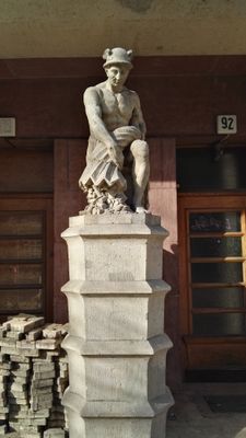Merkur, Bauplastik von Walter Kreußel am Portal des Hauses in der Baumschulenstraße 92 in Berlin-Baumschulenweg