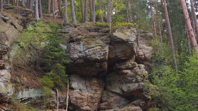 Felsenlandschaft Katte Kurts Klippe, Naturdenkmal eines Aufschlusses im Taleinschnitt Huckershöhle nördlich von Lütersheim, Hessen