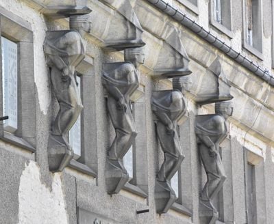 Startende Springer, Bauplastik am Stadtbad Lichtenberg in Berlin, bestehend aus vier Figuren