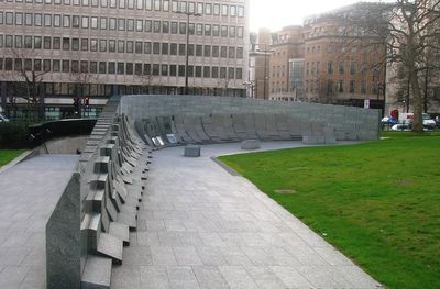 Das Australian War Memorial ist ein Kriegsdenkmal in Westminster mit einer geschwungenen Wand aus graugrünem Granit aus Westaustralien. Die Steinoberfläche wird während der Sommermonate von Wasser durchflossen, das über die eingravierten Namen der Gefallenen fließt.