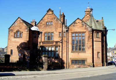 Die Montrose Bibliothek zeigt klassische Architektur mit Steinmauern, großen Fenstern und symmetrischen Gestaltungselementen schottischer Institutsgebäude.