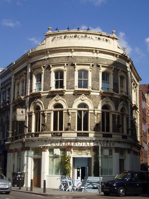 Die Commercial Tavern ist ein denkmalgeschütztes Pub an der Commercial Street in Spitalfields und zeigt eine markante runde Ecke mit weißem Ziegelmauerwerk und verputzten Fassadenelementen. Das Gebäude prägt mit seiner unverwechselbaren Form die Straßenecke und wirkt wie ein solider, praktisch gestalteter Bau aus dem 19. Jahrhundert.