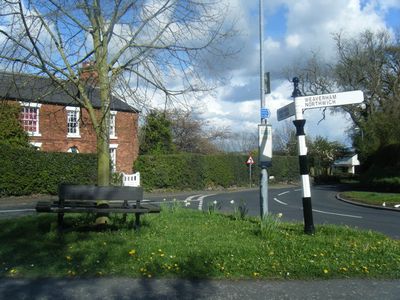 Guidepost at the junction of Cliff Road, Hill Top Road and Acton Lane, fingerpost in Acton Bridge, Cheshire West and Chester, Cheshire, UK