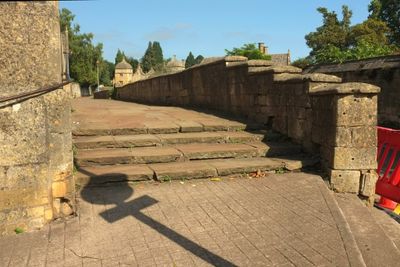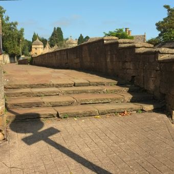 Wall, Raised Pavement And Conduit In Front Of Almshouses, wall in Chipping Campden, Cotswold, Gloucestershire, UK