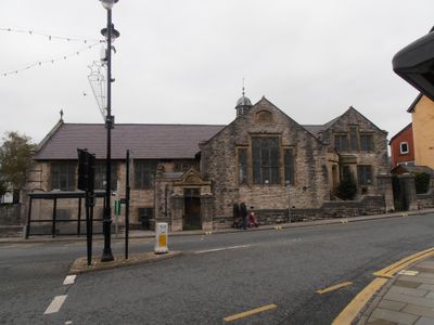 Former Church Institute, including low stone enclosing walls, Grade II listed building in Denbighshire. Prominently-sited on NE side of Lenten Pool cross-roads, between Bridge Street and Henllan Place