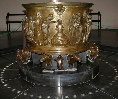 Das Taufbecken ruht auf zwölf Stieren, die auf das bronzene Becken des Tempels Salomons verweisen und fortschrittliche metallurgische Techniken demonstrieren.