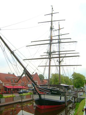 Die Friederike von Papenburg ist ein Museumsschiff mit Holzrumpf, das sich im Papenburg Kanal befindet und etwa 38 Meter lang ist. Das Schiff hat zwei Masten mit gespreizten Marssegeln und weitere traditionelle Segelausrüstung, die typisch für Kauffahrer der früheren Jahrhunderte war.
