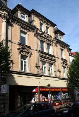 Baudenkmal D-4-63-000-348 in Coburg im Ortsteil Coburg, Wohn- und Geschäftshaus, dreigeschossiger Walmdachbau mit Zwerchhaus, Ziegelmauerwerk mit Sandsteingliederung, seitliche Risalite und reiche Fassadengliederung mit kolossalen Pilastern, Neurenaissance, von Johann Michael Probst, 1892, Erdgeschoss m