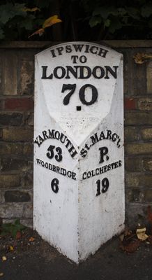 Milestone 70 Outside Number 325, milestone in Ipswich, Suffolk, UK