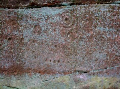 Der Ballochmyle-Felsen trägt hunderte von Vertiefungen und ringförmigen Mustern, die in die Sandssteinfläche gehauen wurden und sich über die vertikale Oberfläche ausbreiten. Die Markierungen befinden sich in der Nähe des Liddell-Baches in einem natürlichen Felshang, der sich zum Fluss hin öffnet.