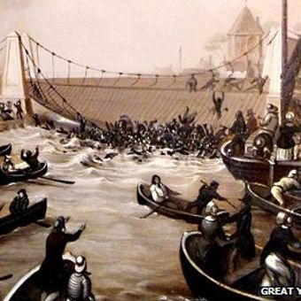 Hunderte von Zuschauern versammelten sich auf der Brücke, um einen Clown in einer Waschbottich auf dem Fluss zu beobachten, als die Ketten nachgaben. Der plötzliche Einsturz ließ Menschen ins Wasser stürzen und wurde zu einer der größten Brückenkatastrophen Großbritanniens im 19. Jahrhundert.