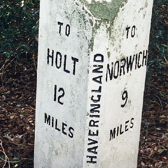 Milepost, c.20yds N of S edge of Great Wood, milepost in Haveringland, Broadland, UK