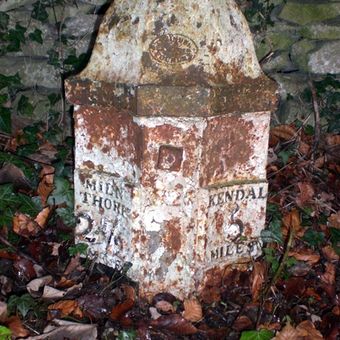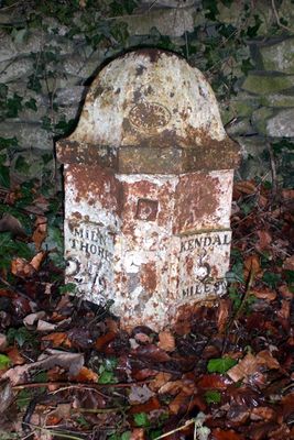 Milepost, slip road from A590, S end of Levens Bridge, N of Lawrence House Farm, milepost in Heversham, South Lakeland, UK