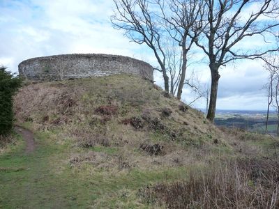Die Ruperra Motte erreicht eine Höhe von 6 Metern mit einem Gipfel von 12 Metern Durchmesser, gelegen auf einem Kamm mit Blick über die walisische Landschaft.