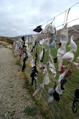 Vierhundert bunte Büstenhalter schmücken einen Metallzaun entlang der Cardrona Valley Road zwischen Wanaka und Queenstown auf der Südinsel.