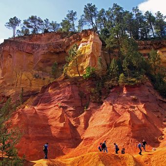 Vom Aussichtspunkt aus sieht man die Ockersteinbrüche mit Gesteinsformationen in gelben bis violetten Farbtönen.