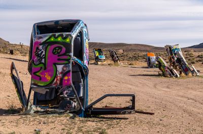 International Car Forest of The Last Church, Kunstinstallation in der Wüste in Goldfield, Nevada, USA.