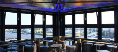 Die Tower Bar befindet sich im 12. Stock des Hotel Hafen Hamburg und bietet einen 360-Grad-Panoramablick über den Hamburger Hafen und die Elbe aus 60 Metern Höhe über der Stadt.