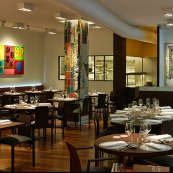 Das Restaurant zeigt zeitgenössische Kunstwerke von Daniel Humair und Tony Soulié, verbindet Kochkunst mit visuellen Ausdrucksformen.